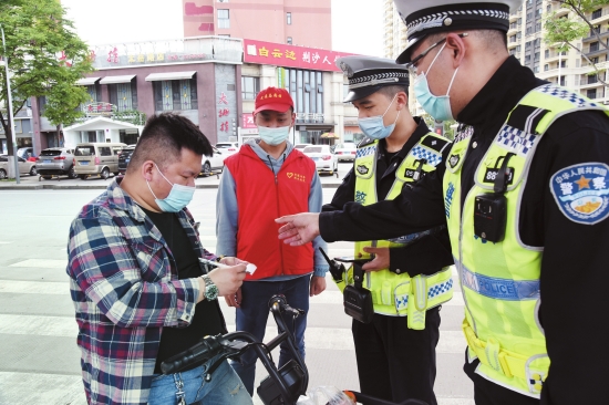 4月28日,交警引导行人自觉遵守交通法规。为确保“五一”期间全市交通安全形势稳定,全市交管部门采取流动巡逻与定点检查相结合的方式开展执法行动,积极营造安全文明、畅通有序的道路交通环境。 (记者梅闻潘路摄)