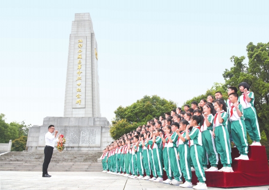 近日,在湘鄂西苏区革命烈士纪念碑前,荆州市实验中学、雨台中学等学校学生在老师指挥下唱响《我们是共产主义接班人》,表达少年儿童继承革命先辈光荣传统、当好接班人的远大志向。连日来,我市各中小学校组织师生走进各个红色教育基地开展红色研学活动,缅怀英烈、宣誓言志、坚定信念,推进党史学习教育走深走实。(通讯员张金枝记者潘路摄)