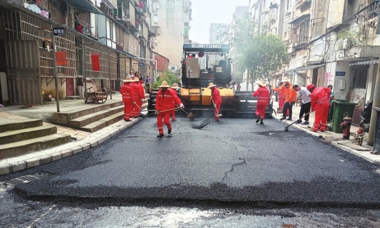 为提升社区居民的居住环境,沙市区加快推进老旧小区改造工作进度。这是施工人员对胜利街道王板桥社区10000平方米路面进行刷黑升级,相关改造有效改善了老旧小区道路环境。(吴秋璇摄)