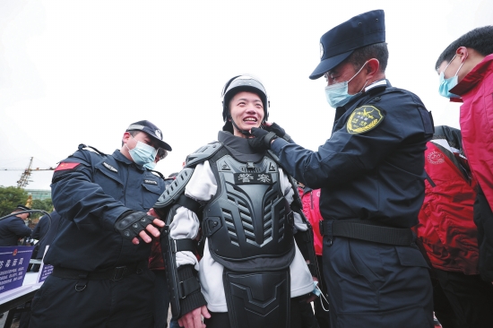 1月10日,在贵州省丹寨县举行的“警营开放日”活动中,市民体验警用装备。(新华社发)