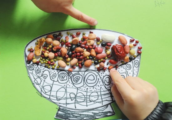 1月10日,安徽省合肥市蜀山区一幼儿园的小朋友用食材和纸板制作“腊八粥”。(新华社发)
