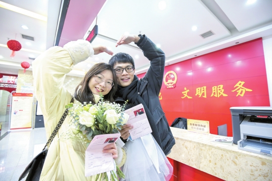 本报讯(记者荆文静通讯员鲁田甜)2022年2月22日是星期二,也是农历正月廿二,因“2”与“爱”谐音,被网友称作。瞅准“好日子”,许多准新人到民政部门领证结婚,我市各地婚姻登记处人气满满,当天共办理婚姻登记605对。 上午7时30分,荆州区、沙市区婚姻登记处工作人员提前到岗,赶早领证的准新人戴着口罩有序排队登记,5对准新人一组同时办理,快速出证。 这样的场景同样出现在各县市区婚姻登记处。为应对2月22日结婚登记“小高峰”,我市各地婚姻登记处提前发布网上预约提醒,公布咨询电话,根据预约人数提前上岗,严格落实常态化疫情防控措施,引导准新人安全有序登记领证。22日当天,全市各婚姻登记处共办理婚姻登记605对,是前两日单日办证数的5倍。 ?2月22日,一对新人在沙市区民政局婚姻登记处办理结婚证后甜蜜合影。 (记者张梦瑶摄) |