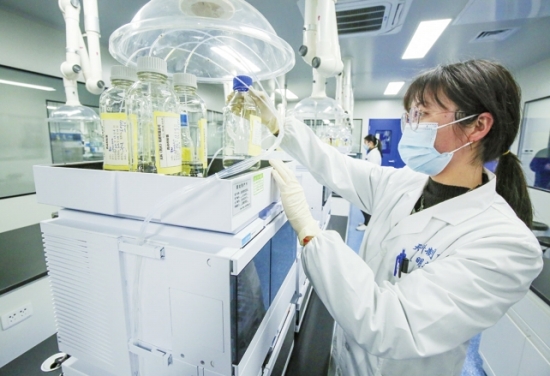 ▲3月21日,天科(荆州)制药有限公司检验人员进行分析操作。目前,该制药产业基地一期总工程量已完成95%。未来,公司将着力建设符合国家GMP要求、达到欧盟和美国FDA标准的原料药产业化基地。 (潘路张梦瑶郑梦婷摄)