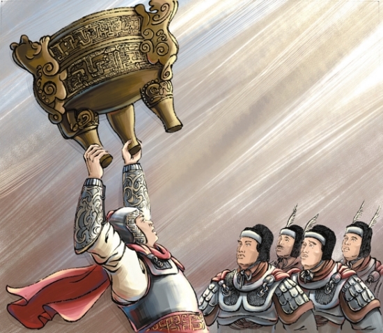 ⑥伍员看到殿前有一个千斤大鼎,便与众人比举鼎。各国君臣谁也不敢向前。只见伍员左手撩起衣角,右手握住鼎的一足,轻叫一声“起!”,便把千斤大鼎举过头顶,吓得各国君臣目瞪口呆。伍员举鼎示威,制服秦穆公,从此秦楚两国开始和睦相处。 |