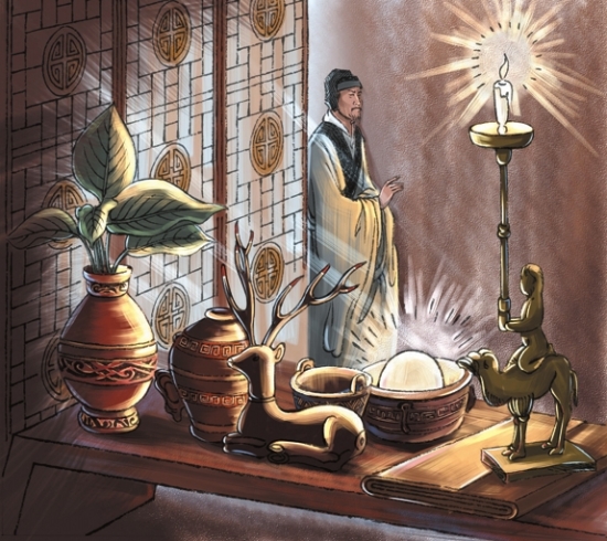 ⑤秦王轻蔑一笑:“你们这些宝贝有什么稀奇的,看看我秦国的宝贝——‘万年烛’,能点上一万年!”秦王命人将蜡烛拿到殿外。殿外北风呼啸,蜡烛腾腾燃烧,烈焰直上。秦王正暗自高兴时,听得伍员禀报前来献宝。“我就是宝贝!”伍员深吸一口气,走到离“万年烛”一丈开外的地方,噗的一声便把“万年烛”吹灭了。秦国君臣大惊失色。 |