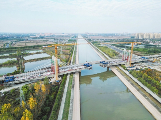 该大桥连续梁总长为395米,目前已经完成了近300米,项目整体完成70%,预计明年3月完成运河两岸合龙。届时,将加快荆州城区和李埠镇两地交通往来,打通两地绿色蔬菜运输通道。(柯以鹏 孙杨 袁磊 摄)