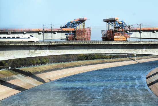 12月19日,在荆荆铁路4标段中铁十二局集团项目部跨江汉运河特大桥建设工地,汉宜铁路上一列动车从施工中的江汉运河特大桥旁快速通过。