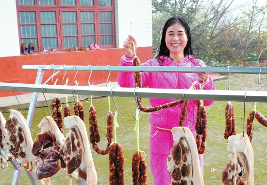 12月27日,在石首市桃花山镇小石村7组,村民正忙着晾晒腌制的腊肠腊肉。