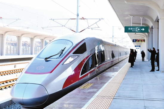 12月30日,在济(南)莱(芜)高铁雪野站,复兴号列车驶出站台。