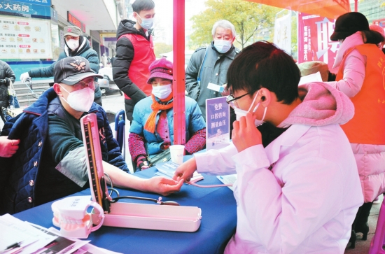 12月28日,在沙市区江汉路一处义诊点,雅贝康口腔医院工作人员为老年居民免费测量血压,进行口腔检查等医疗服务,并予以用药、饮食、运动等方面的健康指导。