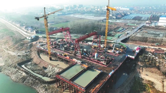 武松高速江陵至松滋段,是荆州市东西向沿江大通道的重要组成部分,包含观音寺长江大桥公安侧主桥、窑头埠大桥、公安北互通、叶家台特大桥工程等建设内容。(通讯员赵勇彭荣莉赵罗炎摄)
