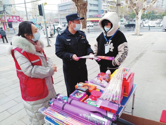 1月16日,朝阳街道东苑社区联合民警对沿街门店进行地毯式检查,对销售烟花爆竹的流动摊贩进行警示教育。 (黄家佳摄)