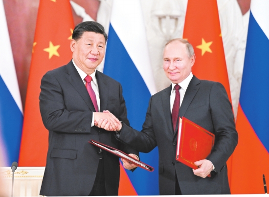 当地时间3月21日下午,国家主席习近平在莫斯科克里姆林宫同俄罗斯总统普京举行会谈。这是会谈后,两国元首共同签署《中华人民共和国和俄罗斯联邦关于深化新时代全面战略协作伙伴关系的联合声明》和《中华人民共和国主席和俄罗斯联邦总统关于2030年前中俄经济合作重点方向发展规划的联合声明》。 (新华社发) 新华社莫斯科3月21日电当地时间3月21日下午,国家主席习近平在莫斯科克里姆林宫同俄罗斯总统普京举行会谈。两国元首就中俄关系及共同关心的重大国际和地区问题进行了真挚友好、富有成果的会谈,达成许多新的重要共识。双方一致同意,本着睦邻友好、合作共赢原则推进各领域交往合作,深化新时代全面战略协作伙伴关系。 3月的莫斯科,天朗气清。习近平乘车抵达克里姆林宫时,克里姆林宫迎宾马队列队欢迎,克里姆林宫司令在下车处迎接。 普京在乔治大厅为习近平举行隆重欢迎仪式。在雄壮激昂的迎宾曲中,习近平和普京分别从乔治大厅两侧沿红地毯阔步走入大厅中央。两国元首紧紧握手,合影留念。军乐团奏中俄两国国歌。 两国元首先后举行小范围、大范围会谈。 习近平指出,中俄互为彼此最大邻国,同俄罗斯巩固和发展长期睦邻友好关系,符合历史逻辑,是中方的战略抉择,不会因一时一事而改变。自我10年前首次对俄进行国事访问以来,中俄双方相互尊重、相互信任、互利互惠,两国关系历久弥坚,呈现更加全面、更加务实、更具战略性的特点。此访期间,我们车队途经之处,很多俄罗斯民众自发挥手致意,让我深切感到中俄关系具有深厚民意基础。不管国际风云如何变幻,中方都将继续致力于推进中俄新时代全面战略协作伙伴关系。我此次对俄罗斯的国事访问是友谊之旅、合作之旅、和平之旅。中方愿同俄方一道,继往开来,丰富中俄新时代全面战略协作伙伴关系内涵,为两国人民创造更多福祉,为促进人类进步事业作出更大贡献。 习近平指出,当前,百年变局加速演进,国际力量对比深刻演变。作为联合国安理会常任理事国和世界主要大国,中俄责无旁贷,应该共同努力,引导和推动全球治理朝着符合国际社会期待的方向前进,推动构建人类命运共同体。双方要在涉及彼此核心利益问题上相互支持,共同抵制外部势力干涉内政。要加强在国际事务特别是联合国、上海合作组织、金砖国家合作机制等多边框架内的沟通协调,践行真正的多边主义,反对霸权主义和强权政治,促进全球疫后经济复苏,推动多极化趋势发展,推动全球治理体系变革完善。 (下转第6版) |