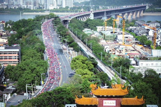 4月16日,参赛选手经过黄鹤楼。