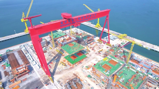 在海油工程天津智能化制造基地,渤中19-6凝析气田一期开发项目WHPM平台最后一片甲板片正在吊装作业(5月8日摄,无人机照片)。