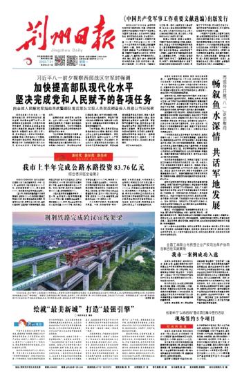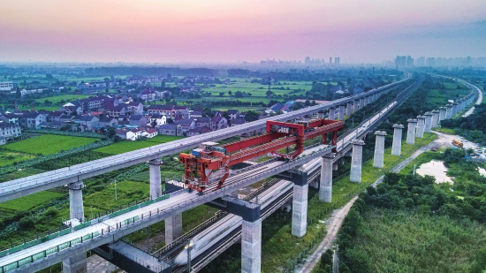 7月28日凌晨,经过中铁十二局建设者5小时封锁施工,新建荆门至荆州铁路跨汉宜线最后一孔箱梁精准落在汉江运河2号特大桥上,标志着荆荆铁路成功跨越汉宜线,为后续桥面系和铺轨施工打通了“咽喉要道”。新建荆门至荆州铁路自荆门西站起,途经荆门、沙洋、荆州等县(市),终点与荆州站接轨,正线全长77.479公里。荆荆铁路是我国“八纵八横”高速铁路网中呼(和浩特)南(宁)高铁的重要组成部分,预计明年建成通车,届时湖北将实现“市市通高铁”。 (张梦瑶 摄)