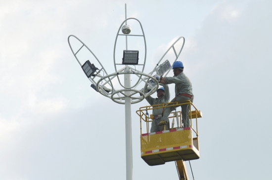 日前,在荆州古城东门外金凤广场,市路灯管理服务中心工作人员进行高空路灯维护作业。烈日下,路灯人坚守岗位,穿梭于大街小巷,确保夜间照明设施正常运转。 (潘路摄)