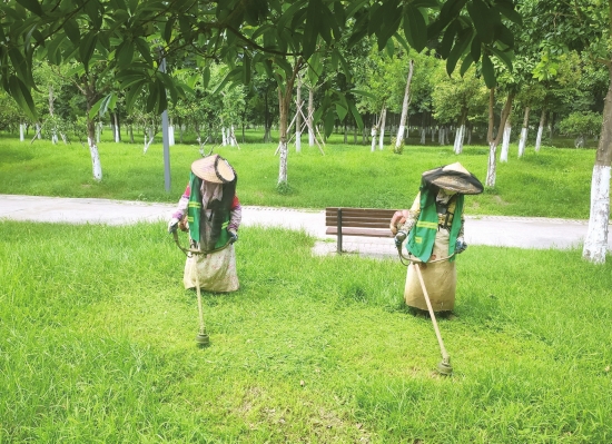 日前,在市临江仙公园桥西草坪上,绿化工人冒着高温修剪草坪。连日来,市公园管理处绿化工人们不畏酷暑,加强公园游园绿化养护,用辛勤的汗水扮靓城市风景线。 (潘路付亚明摄)