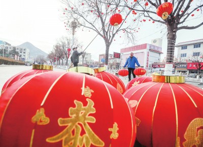 12月27日,工作人员在河北省迁西县城区悬挂灯笼。新年临近,大街小巷张灯结彩,人们以丰富多彩的活动,喜迎2024年。(新华社 发)