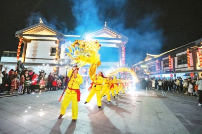 截至2月17日,全区共接待游客45.21万人次,实现旅游综合收入3.32亿元。图为春节期间在荆街举行的龙狮贺新年、武财神巡游、流动舞台表演活动。(荆宣 摄)