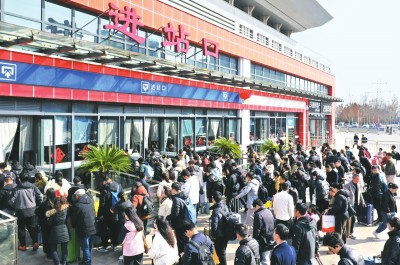 据荆头条消息,受天气影响,荆州站50趟列车今日临时停运。这几天,荆州火车站返程客流集中,车站工作人员有序引导乘客乘车,并及时发布出行提示。(梅闻摄)