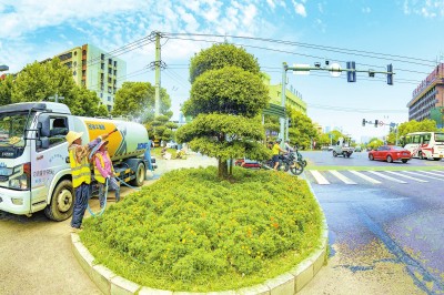 昨日,市园林工人采用喷灌、滴灌、输液等方式,对中心城区主次干道行道树、绿化带及公园绿地内苗木进行补水、养护。