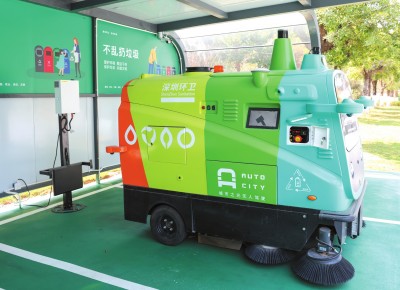3月19日,在深圳市坪山区坑梓街道,环卫机器人完成清扫工作后回到基站进行无线充电。近年来,该区积极打造全域全时全场景人工智能环卫机器人集群应用示范场景,设立2个人工智能环卫运营指挥中心和8个智能补给站,投入59台人工智能环卫设备。 (新华社 发)