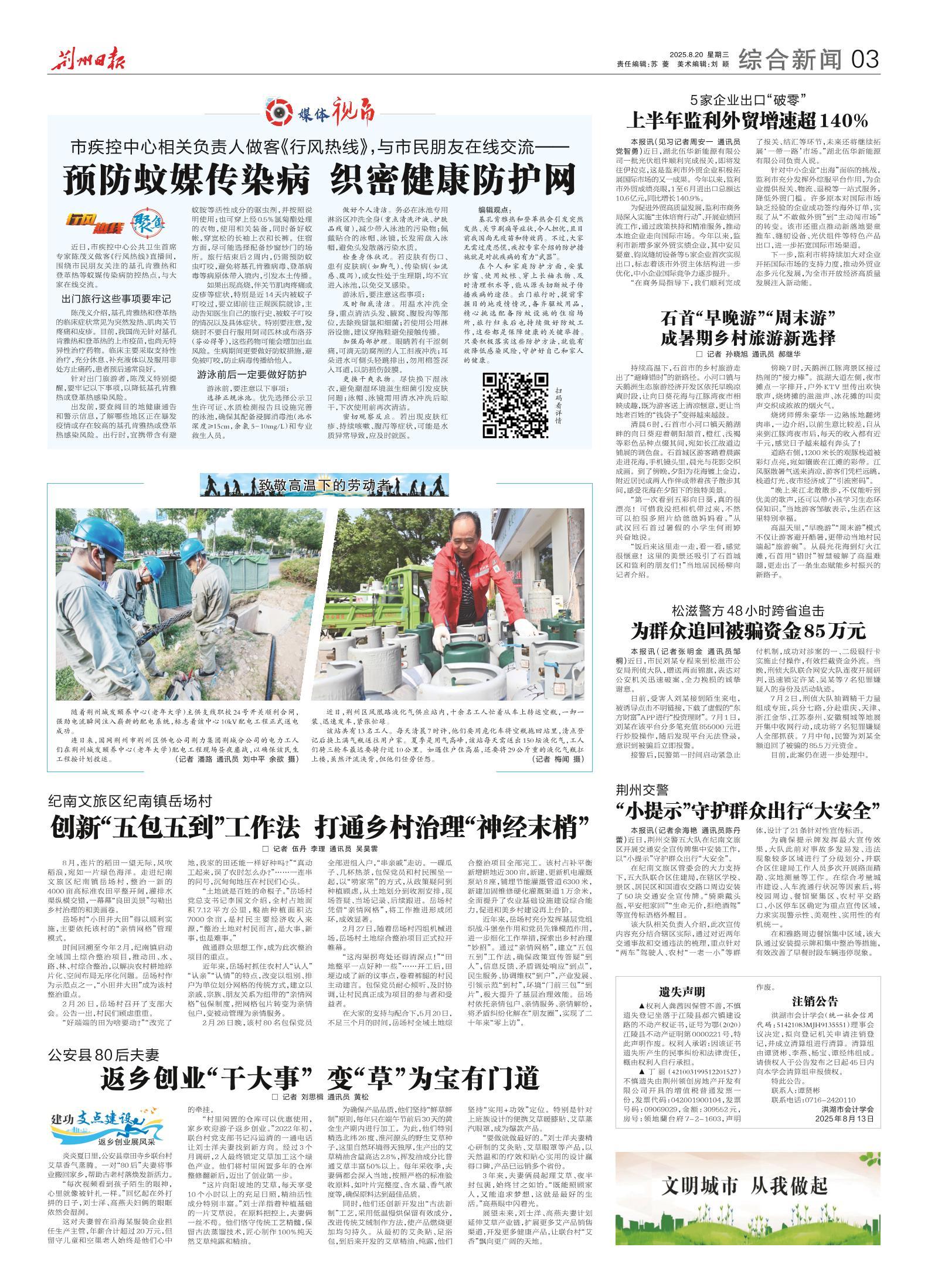 《荆州日报》(电子版)的一切内容(包括但不限于文字、图片、PDF、图表、标志、标识、商标、版面设计、专栏目录与名称、内容分类标准以及为读者提供的任何信息)仅供荆州日报读者阅读、学习研究使用,未经荆州日报及/或相关权利人书面授权,任何单位及个人不得将《荆州日报》(电子版)所登载、发布的内容用于商业性目的,包括但不限于转载、复制、发行、制作光盘、数据库、触摸展示等行为方式,或将之在非本站所属的服务器上作镜像。否则,荆州日报将采取包括但不限于网上公示、向有关部门举报、诉讼等一切合法手段,追究侵权者的法律责任。