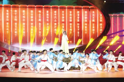 击石拊石,韶乐恢弘。万人诵读《千秋回响》拉开文艺演出的序幕,童音清越如磬,演员声若洪钟,交织演绎屈原、李白、陆游等诗人的千古名句。全场齐吟《离骚》——“路漫漫其修远兮,吾将上下而求索”,荆风楚韵的沉郁雄浑在夜空中久久回荡。