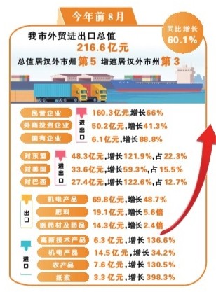 本报讯(通讯员操策 熊丹 记者田心怡)据海关统计,今年1至8月,我市外贸进出口总值216.6亿元人民币,同比(下同)增长60.1%,总值居汉外市州第5,增速居汉外市州第3,其中进口总值32.6亿元,增长37.8%;出口总值184亿元,增长64.8%。
