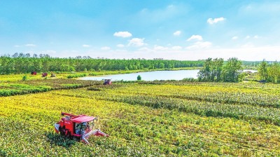 近日,在荆州区李埠镇网新村连片的高粱地里,一台台大型收割机来回穿梭,高效完成收割、脱粒、秸秆粉碎、装车等工作,现场一派繁忙景象。与此同时,全镇8000亩水稻和4000亩黄豆也陆续进入收获期,微风轻拂,稻穗随风起伏,勾勒出一幅喜人的“丰”景图。