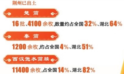 “截至目前,荆州已出土战国楚简16批、4100余枚,数量约占全国32%、湖北64%;秦简1200余枚,约占全国4%、湖北51%;西汉饱水简牍11400余枚,占全国14%、湖北82%。其中,有最全版本的楚简《诗经》,最早的楚简‘乐’简,最早的楚简‘药方’‘字谜’,最早的乘法口诀楚简‘九九术’,最早的朱砂线分栏楚简‘日书’,秦简仅见的‘二十八宿占’,最早西汉律令类竹简的张家山汉简……”荆州博物馆党委书记、馆长杨开勇介绍,荆州作为战国时期楚国的都城所在、中国简牍出土的核心区域,其出土的战国、秦汉简牍数量庞大、内容丰富、价值极高,为研究战国秦汉时期的历史、文化、思想等提供了宝贵的实物资料。