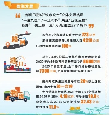 以大通道促进大开放,以大路网带动大发展。“十四五”以来,荆州交通建设迎来大发展,荆州沙市机场、荆荆高铁建成运营,沙公高速杨家厂至孟家溪段、江北高速东延线、武松高速洪湖段、洪湖赤壁长江大桥“三路一桥”建成通车,全市高速公路里程增至723公里、铁路营运里程增至246.5公里,港口年吞吐量即将突破亿吨大关。