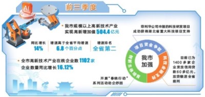 本报讯(记者赵叶秋 通讯员陈晓青)前三季度,我市规模以上高新技术产业实现高新增加值504.4亿元,同比增长14%,增速高于全省平均增速6.8个百分点、增速排名全省第二。