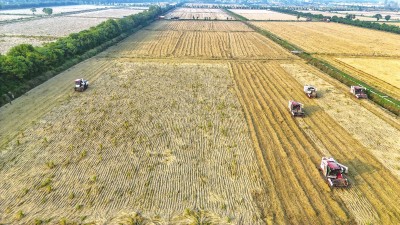 近日,江陵县六合垸农场鸭子湖分场抓住天气转晴窗口,调配收割机、运输车30余台,全面推进水稻抢收,确保颗粒归仓。目前,累计完成11670亩,占应收面积98%,并同步回收秸秆2488吨。