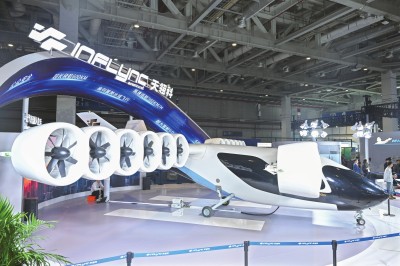 11月6日在进博会汽车及智慧出行展区天翎科展台拍摄的L600全尺寸倾转涵道翼eVTOL。这是该产品全球首发。