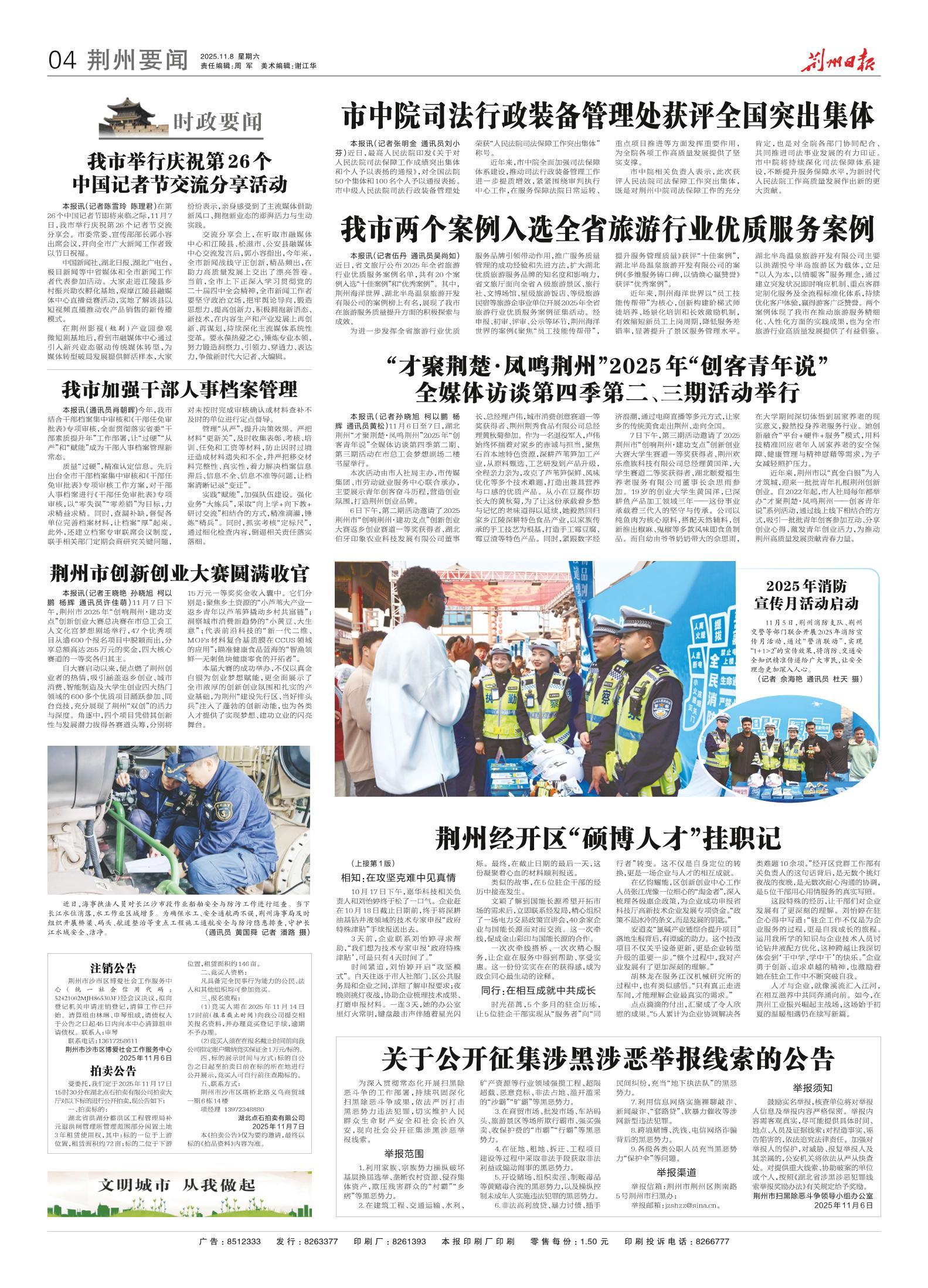 《荆州日报》(电子版)的一切内容(包括但不限于文字、图片、PDF、图表、标志、标识、商标、版面设计、专栏目录与名称、内容分类标准以及为读者提供的任何信息)仅供荆州日报读者阅读、学习研究使用,未经荆州日报及/或相关权利人书面授权,任何单位及个人不得将《荆州日报》(电子版)所登载、发布的内容用于商业性目的,包括但不限于转载、复制、发行、制作光盘、数据库、触摸展示等行为方式,或将之在非本站所属的服务器上作镜像。否则,荆州日报将采取包括但不限于网上公示、向有关部门举报、诉讼等一切合法手段,追究侵权者的法律责任。