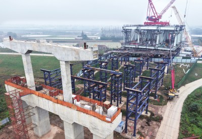 11月8日,在荆州李埠长江公铁大桥1标建设项目现场,架桥机高高耸立,施工人员正紧锣密鼓地搭设通道、安装钢桁梁,现场一派忙碌景象。