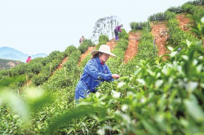 行走在从家到茶园的路上,欧阳月英的一天开始了。沿着山路转过几道弯,往远处眺望,可以看见昔日的荒坡已化作漫山遍野的绿意,一垄垄茶树依山顺势,织就连绵起伏的画卷。晨光初破晓,整片茶园还笼罩在薄纱般的雾气里,但已经有不少像欧阳月英一样的村民早早来到茶园,背着背包在茶垄间忙碌着。