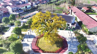 近日,资市镇资福寺社区1900多年树龄的古银杏树迎来“颜值巅峰”,为秋日添上了一抹绚丽色彩,成为网红打卡地。 (韩俊康 郑文刚 摄)