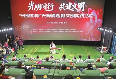 12月3日是第34个国际残疾人日。“光明影院”无障碍观影文明实践活动在广西南宁市青秀区博纳戏幕影城举行。40余名视障人士在亲属及志愿者的陪同下共同欣赏无障碍电影《热烈》,在光影叙事中感受文化魅力、体悟文明温度。