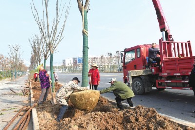 为完善道路配套设施,美化荆江大堤周边环境,12月9日,荆州高新区绿化部门在大禹大道种植100余棵榉树和栾树,并在道路两旁路面栽上绿植。              (记者 梅闻 摄)