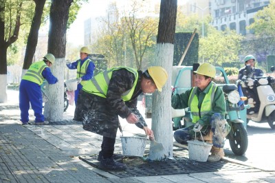近日,市白云园林绿化工程有限公司的工人为行道树树干仔细涂白。按照统一标高、规范操作要求,中心城区主次干道、公园、游园的树木将于12月底之前全部完成涂白,以更整洁美观的姿态迎接新年。                               (记者 潘路 通讯员 袁澧 摄)