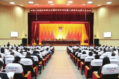 区政协主席刘俊平代表政协荆州市沙市区第七届委员会常务委员会向大会报告工作。