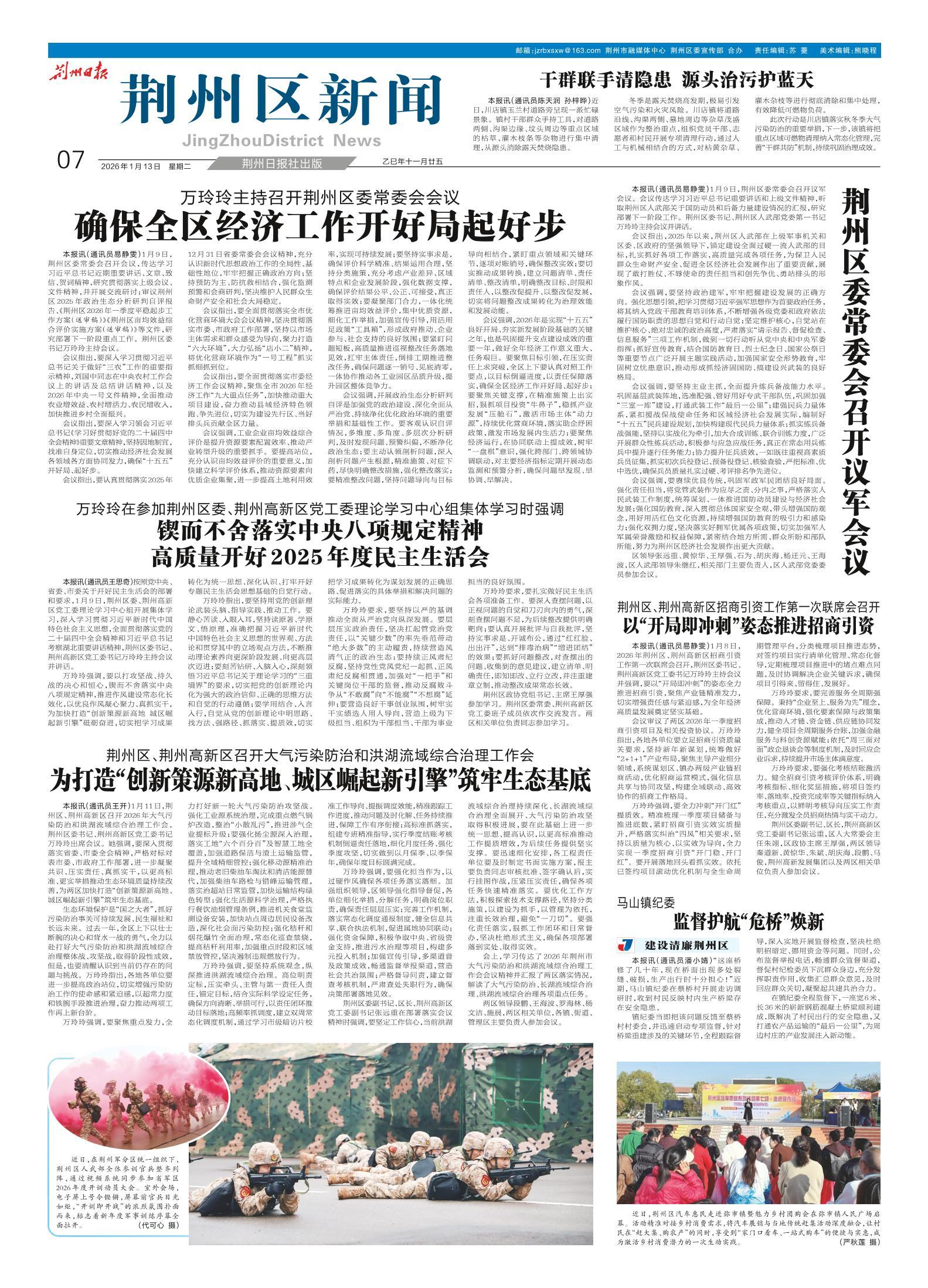 本报讯(通讯员易静雯)1月9日,荆州区委常委会召开会议,传达学习习近平总书记近期重要讲话、文章、致信、贺词精神,研究贯彻落实上级会议、文件精神,并开展交流研讨;审议荆州区2025年政治生态分析研判自评报告、《荆州区2026年一季度平稳起步工作方案(送审稿)》《荆州区亩均效益综合评价实施方案(送审稿)》等文件,研究部署下一阶段重点工作。荆州区委书记万玲玲主持会议。