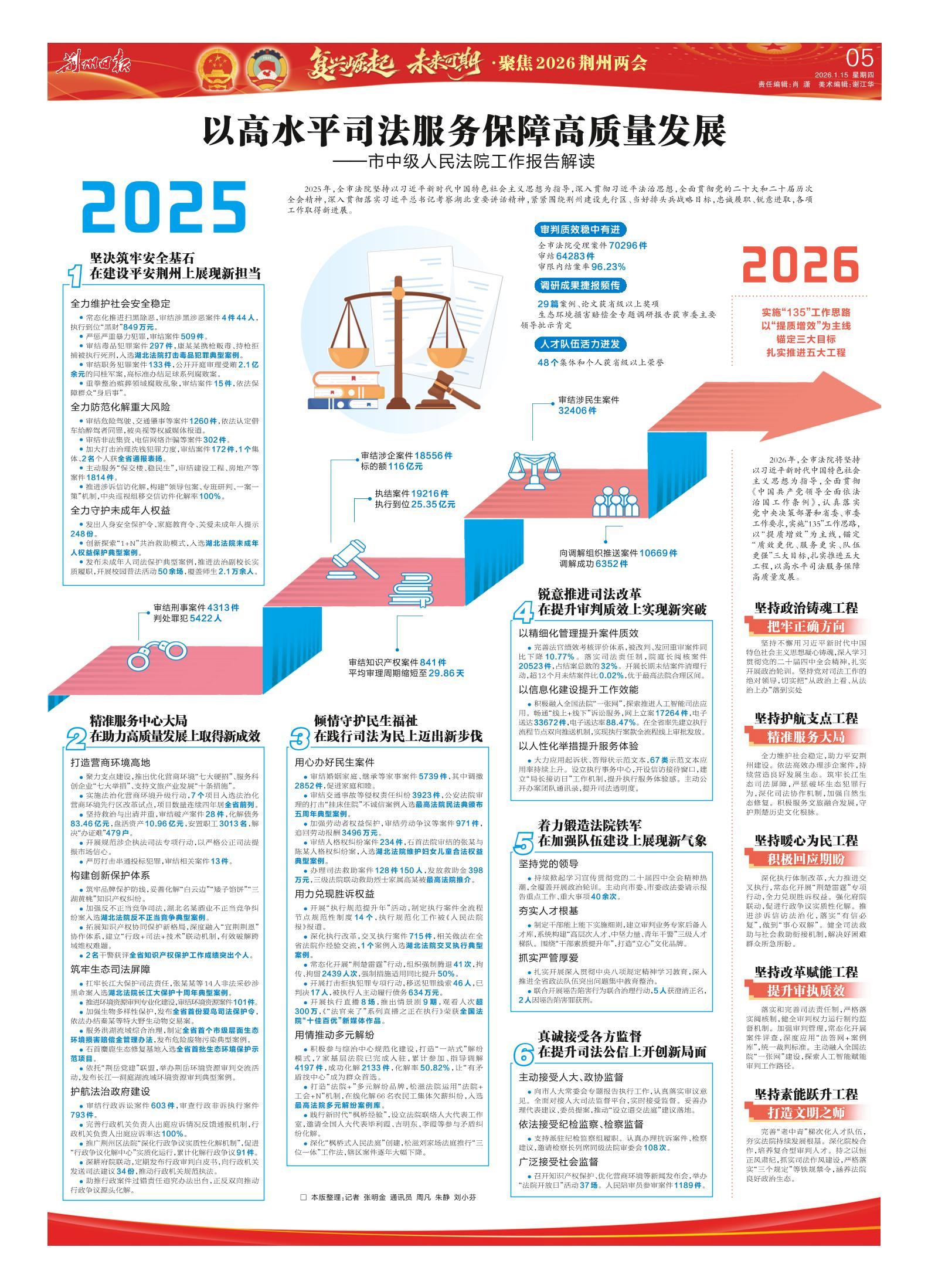 全力维护社会稳定,助力平安荆州建设。依法高效办理涉企案件,持续营造良好发展生态。筑牢长江生态司法屏障,严惩破坏生态犯罪行为,深化司法协作机制,加强自然生态修复。积极服务文旅融合发展,守护荆楚历史文化根脉。