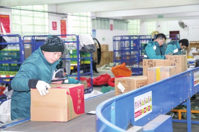 1月21日,在中国邮政荆州市分公司沙市区太岳揽投站,随着邮车准时抵达,现场工作人员有序搬运卸货,将包裹分发、装筐、验码和装车,现场快捷高效。