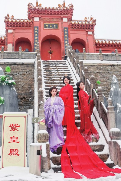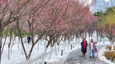 东门瓮城内,温情四溢。一家老小手牵着手,在积雪上踩出深深浅浅的脚印,呵出的团团白气氤氲着冬日暖意。楚国八百年城市公园静卧于皑皑白雪之中,亭台隐于雪中,草木覆以银装,宛如一幅徐徐展开的水墨长卷。九老仙都里,偶有身着战国袍的游人缓步而行,衣袂翩跹与漫天落雪相映,恍惚间,时光仿佛在此刻悄然驻足,古今交融的韵味在古城弥漫。行至中山公园楚梅园,又是另一番雅致光景。近400株梅树迎雪绽放,暗香浮动,引得市民与摄影爱好者纷纷驻足,定格梅雪争艳的美丽画面。