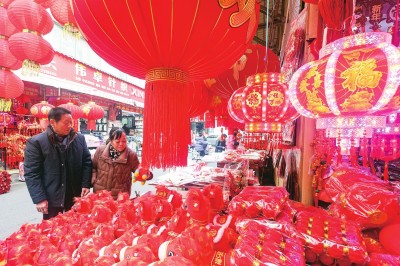 随着春节脚步临近,市场内人气渐旺,市民们穿梭于摊位之间,精心选购春联、福字以及日用百货、衣服鞋袜等商品,现场一派繁忙热闹的消费景象。(记者 张梦瑶 摄)
