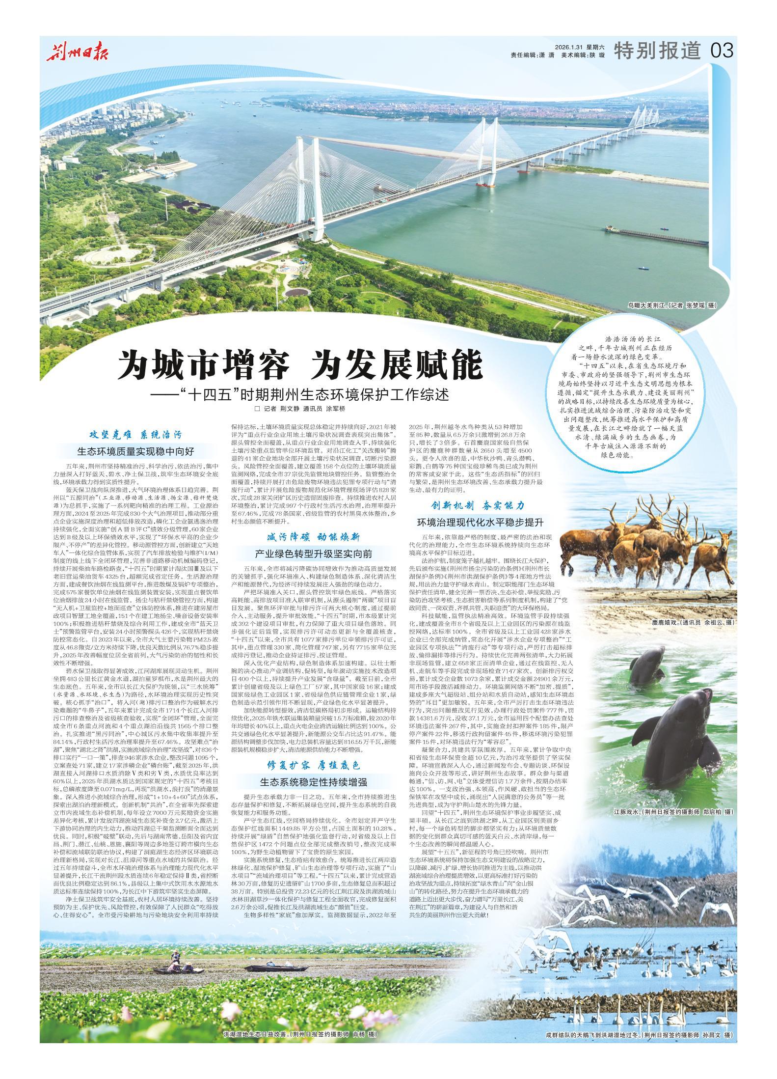 回望“十四五”,荆州生态环境保护事业步履坚实、成果丰硕。从长江之滨到洪湖之畔,从工业园区到美丽乡村,每一个绿色转型的脚步都坚实有力;从环境质量数据的变化到群众真切可感的蓝天白云、水清岸绿,每一个生态改善的瞬间都温暖人心。